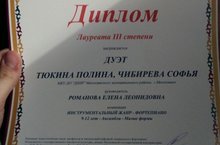 Очередная ПОБЕДА!!!!!! 4 мая в Набережных Челнах, Фондом "Планета талантов" при информационной поддержки Министерства Культуры РТ прошел Международный конкурс-фестиваль в рамках проекта "Планета талантов". В нем приняли участие учащиеся ДШИ - фортепианный ансамбль Чибирева Софья и Тюкина Полина ( препод. Романова Е.Л.). Поздравляем наших девочек, они награждены Дипломом Лауреата lll степени.