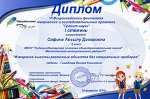 Поздравляем победителя VI Всероссийского фестиваля творческих и исследовательских проектов "Гранит науки" ученицу 6 класса Сафину Айсылу!