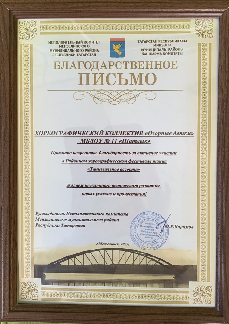 Воспитанница МБДОУ № 11 "Шатлык" Храмутичева Маргарита заняла I место в районной олимпиаде по развитию речи "Дядя Стёпа и все, все, все" среди воспитанников городских дошкольных образовательных учреждений Мензелинского муниципального района Республики Татарстан.