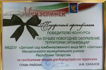 Коллектив МБДОУ # 11 "Шатлык" стал Победителем конкурса "На лучшее новогоднее оформление территории детского сада" и награжден Подарочным сертификатом на приобретение техники для благоустройства территории