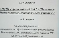По итогам рейтинга за 2019 - 2020 учебный год среди дошкольных образовательных учреждений МБДОУ # 11 "Шатлык" занял 1 место!
