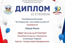 Воспитанник МБДОУ № 11 "Шатлык" (воспитатель Саидова А. Ш.) принял участие в республиканском конкурсе "Это Родина моя - всё люблю на свете я!" и занял 2 место. Поздравляем!