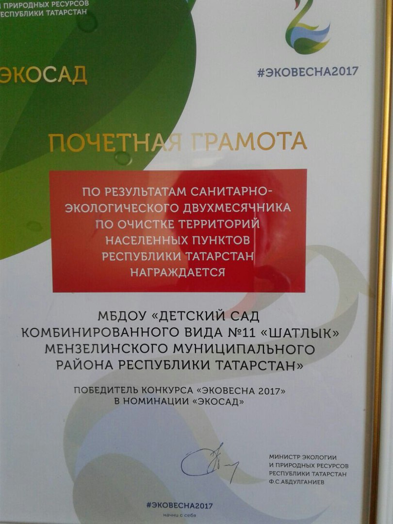 По результатам санитарно-экологического двухмесячника по очистке территорий населённых пунктов Республики Татарстан МБДОУ № 11 "Шатлык" стал победителем конкурса "ЭКОВЕСНА 2017" в номинации "ЭКОСАД".