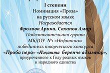 Воспитанники МБДОУ №1 "Нефтяник" Фролова Арина и Сахапов Амир приняли участие в конкурсе "Проба пера" "Иҗатта беренче адымнар" и заняли I место в номинации "Проза" на русском языке.