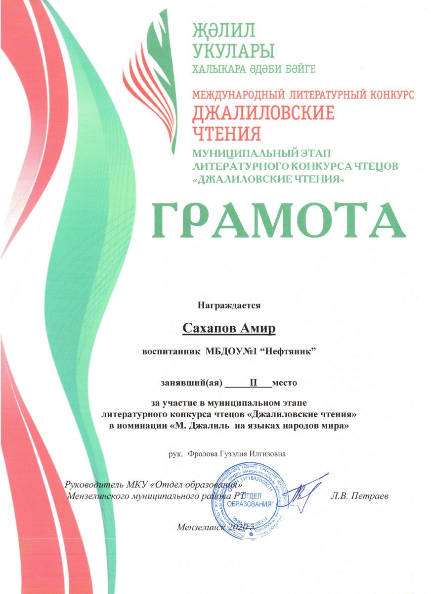 Завершился муниципальный этап литературного конкурса чтецов "Джалиловские чтения", в котором приняли участие наши воспитанники. Петраева Айвика ("Шошо"на марийском языке, воспитатель Галиева Л.К.) - I место, Сахапов Амир (Goob bye, my clever girl" на английском языке, воспитатель Фролова Г.И.) - II место в номинации "М.Джалиль на языках народов мира". Фролова Арина ("Красная ромашка", воспитатель Гассман Е.Р.) - III место в номинации "М.Джалиль на русском". И Хасанова Сююмбике ("Парашютсыз күрчак", воспитатель Галиева Л.К.) -получила сертификат за участие в номинации "М.Джалиль на татарском". Поздравляем ваш наши звездочки!!!!!!!