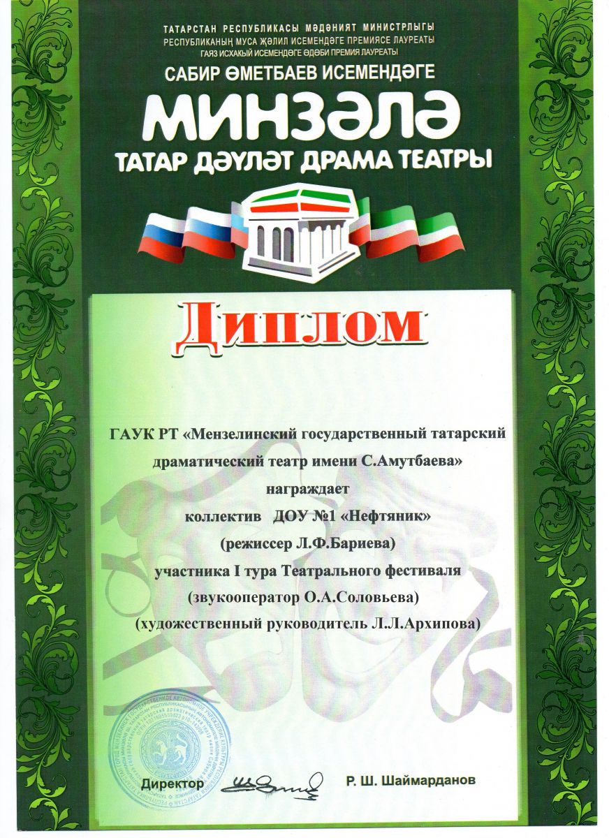Сегодня в МБДОУ №1 "Нефтяник" в рамках театрального фестиваля самодеятельных театральных коллективов, посвященного "Году театра", организаторами которого является ГАУК РТ "Мензелинский государственный татарский драматический театр им.С.Амутбаева", состоялась премьера сказки "Дюймовочка". Режисер Бариева Л.Ф., звукооператор Соловьева О.А., художественный руководитель Архипова Л.Л.
