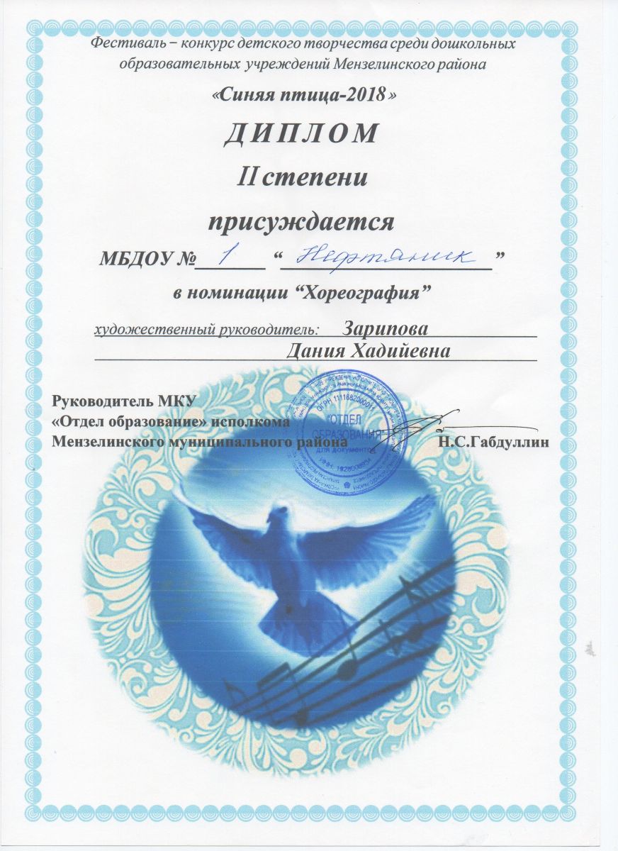 Сегодня на базе МБОУ "Гимназия" г. Мензелинска состоялся районный конкурс "Синяя птица - 2018". Воспитанники нашего детского сада приняли в нем участие. По итогам конкурса в номинации хореография наш танцевальный коллектив награжден Дипломом 2 степени. Молодцы поздравляем!!!