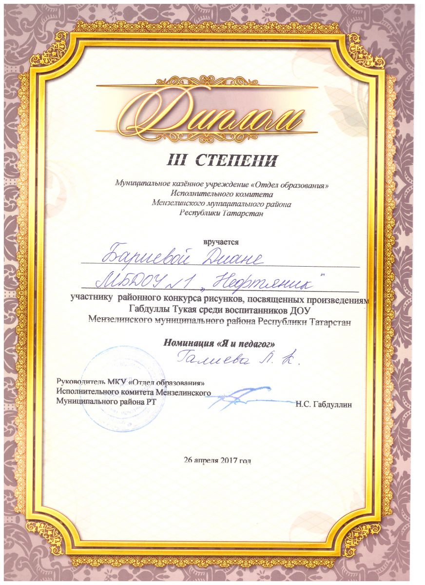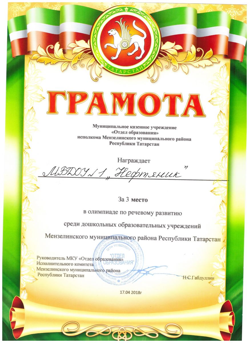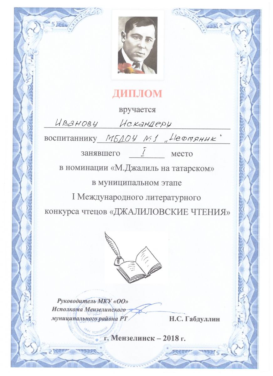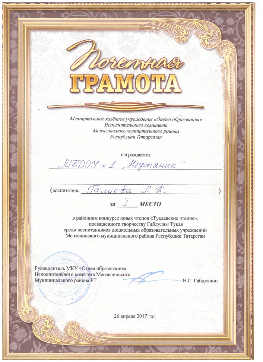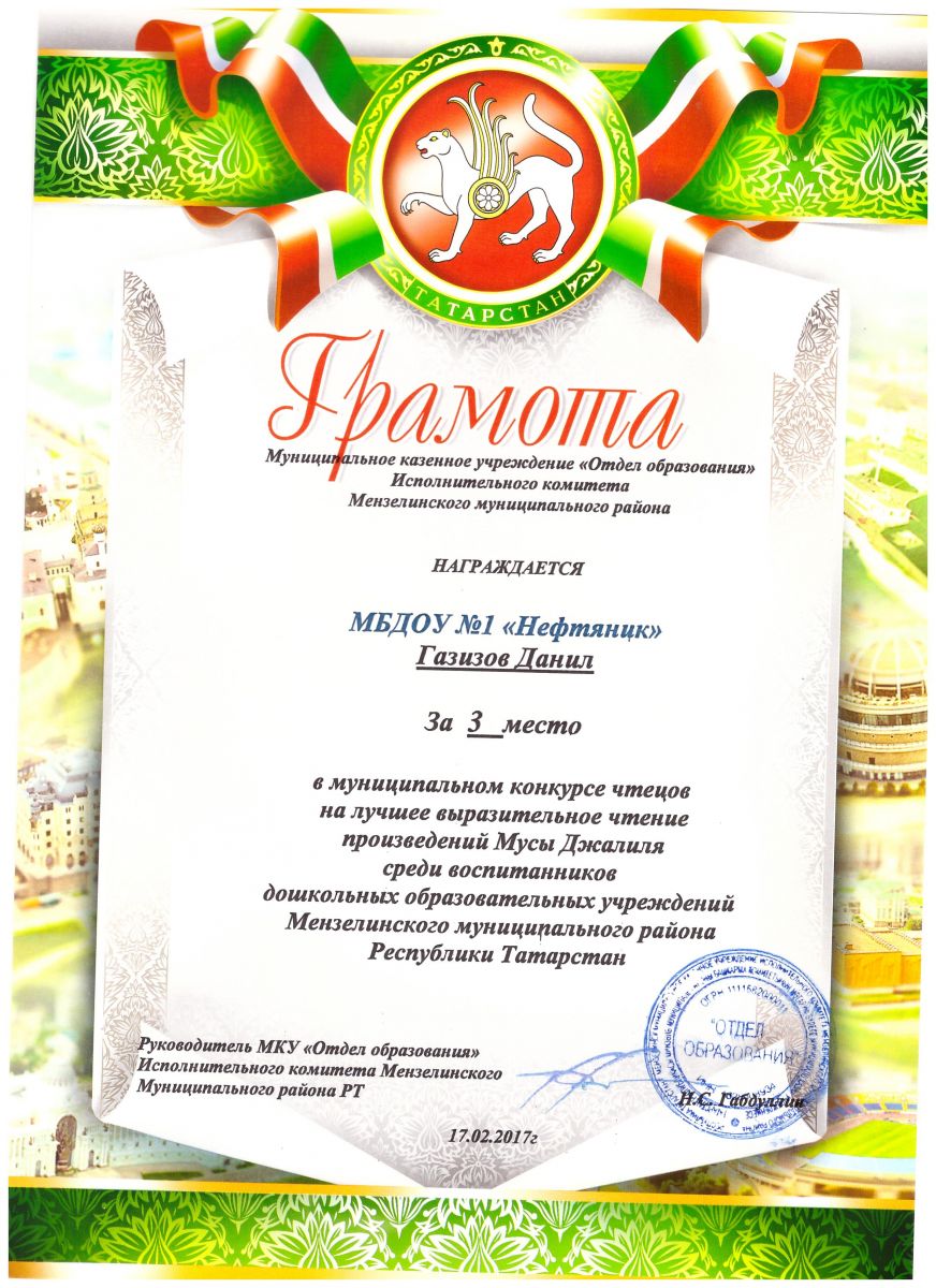 Грамота 1 место конкурс чтецов посвящен.133 ти летию Г.Тукая воспитан. Иванов Искандер