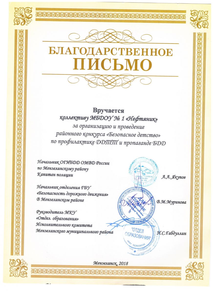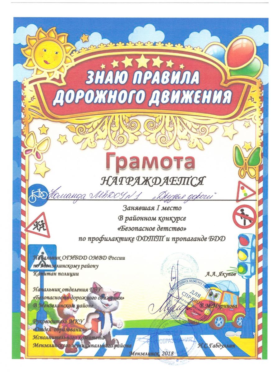 Грамота 1 место "Безопасное детство" по профилактике ДДТТ и пропоганде БДД