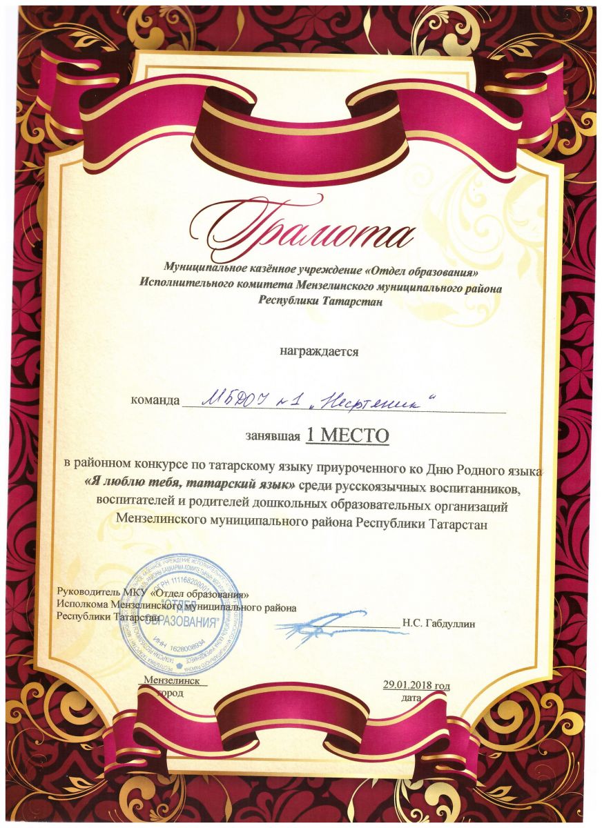 Грамота 1 место "Я люблю тебя, татарский язык"