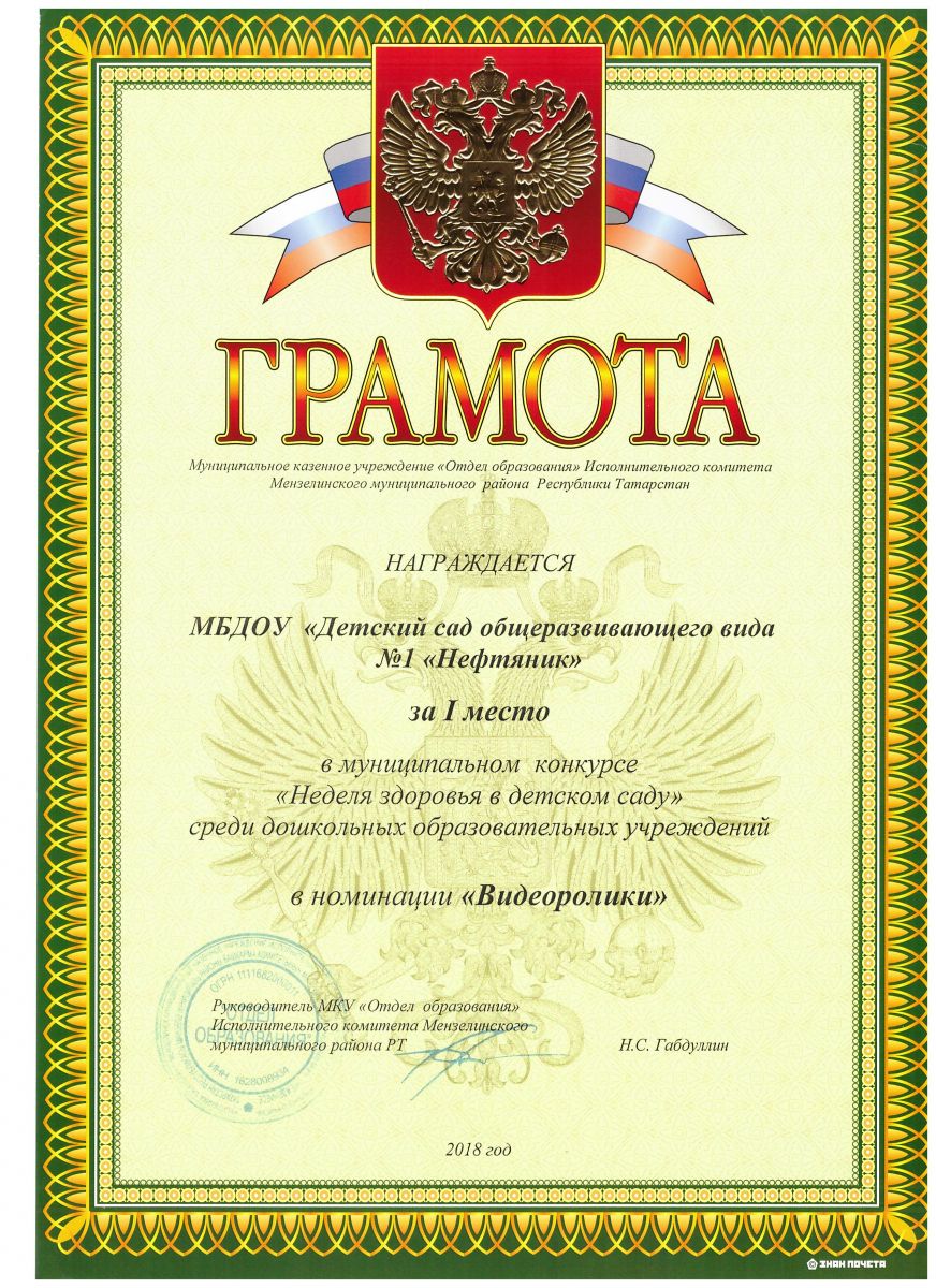 Грамота 1 место в номинации Видиоролики "Неделя здоровья в детском саду"