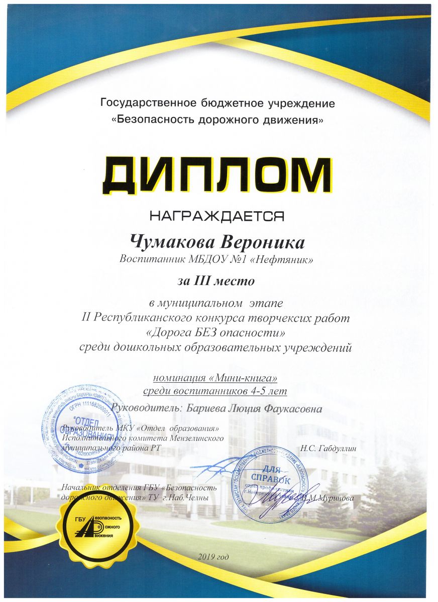 Диплом 3 место Дорога безопасности, среди воспитанников