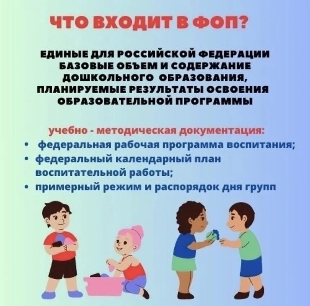 С 1 сентября 2023 года в соответствии с Приказом Министерства Просвещения Российской Федерации от 25 ноября 2022 г. № 1028 "Об Утверждении Федеральной образовательной программы дошкольного образования" дошкольные образовательные учреждения начнут работать по новой Федеральной образовательной программе – ФОП ДО.