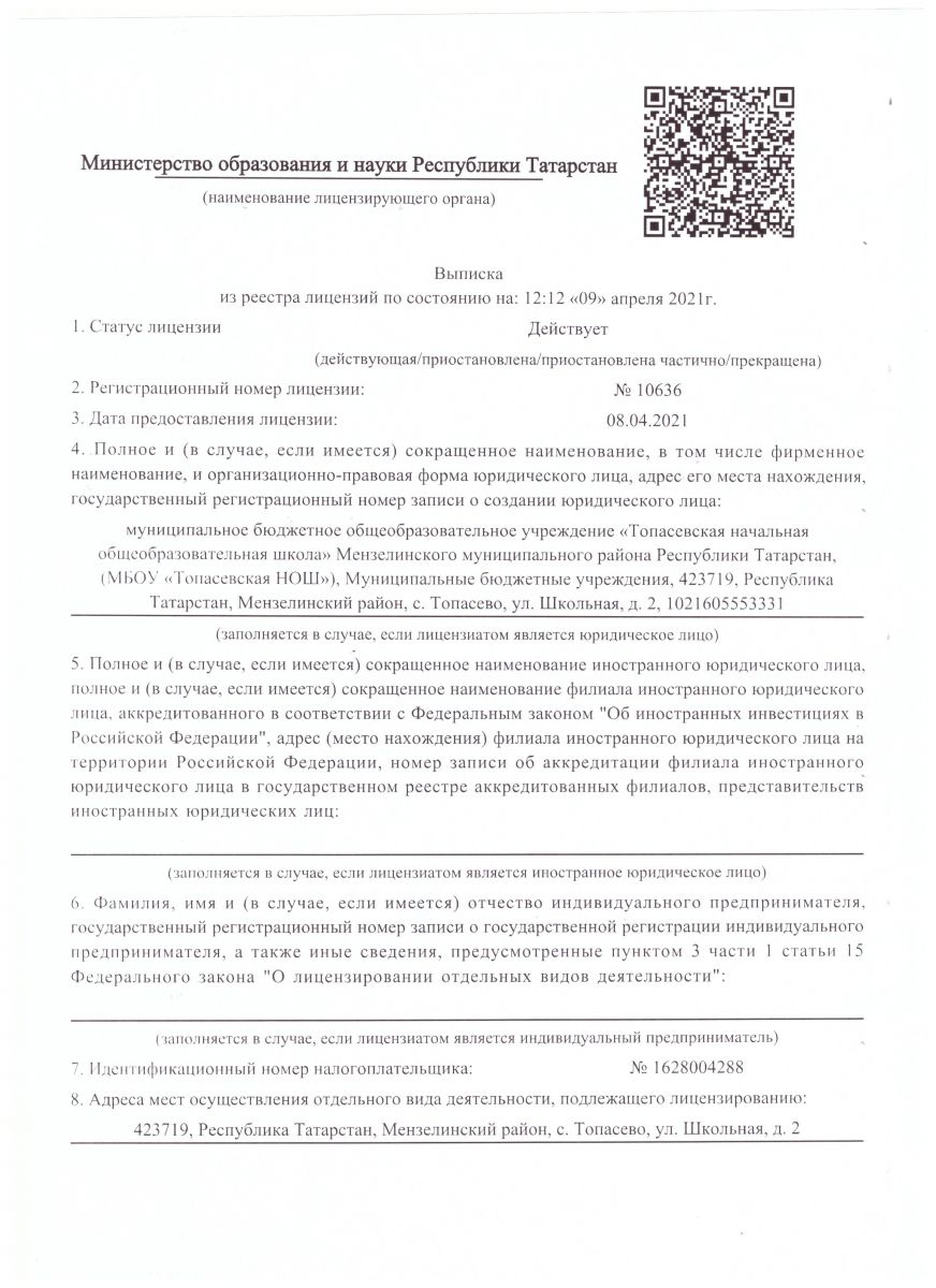 | Адрес: | 423719, Республика Татарстан, Мензелинский район, с.Топасево, ул. Школьная, д. 2 |
