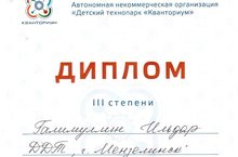 Поздравляем наших воспитанников технического объединения "Юный физик" (руководитель Ахмадиева Г.С.) занявших призовые места в открытом конкурсе республиканского уровня "Кванториада-2016", который проходил в декабре 2016 года в Детском технопарке "Кванториум" г. Набережные Челны.