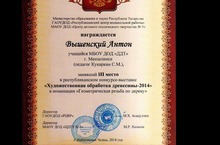 Художественная обработка древесины - 2014 28.03.2014 Воспитанники МБОУ ДОД "ДДТ" приняли участие в Республиканском конкурсе-выставке "Художественная обработка древесины - 2014", который проходил в МАОУ ДОД "Центр детского технического творчества" г. Набережные Челны. Воспитанники педагога Кукаркина С.М. заняли призовые места и награждены дипломами. Вышенский Антон - III место в номинации "Геометрическая резьба по дереву", Чумаков Алексей - III место в номинации "Макеты".