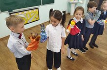Воспитанники объединения "Занимательный английский" (ученики 1 класса СОШ №3) во время занятий осваивают английский язык общаясь друг с другом используя кукольный театр.