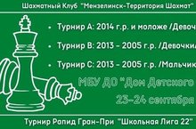 МБУ ДО "Дом Детского Творчества" и ШК "Мензелинск-Территория Шахмат" 23-24 сентября 2022 г. начинают для юных шахматистов Мензелинского района проведение турнира Рапид Гран-При "Школьная Лига 22".