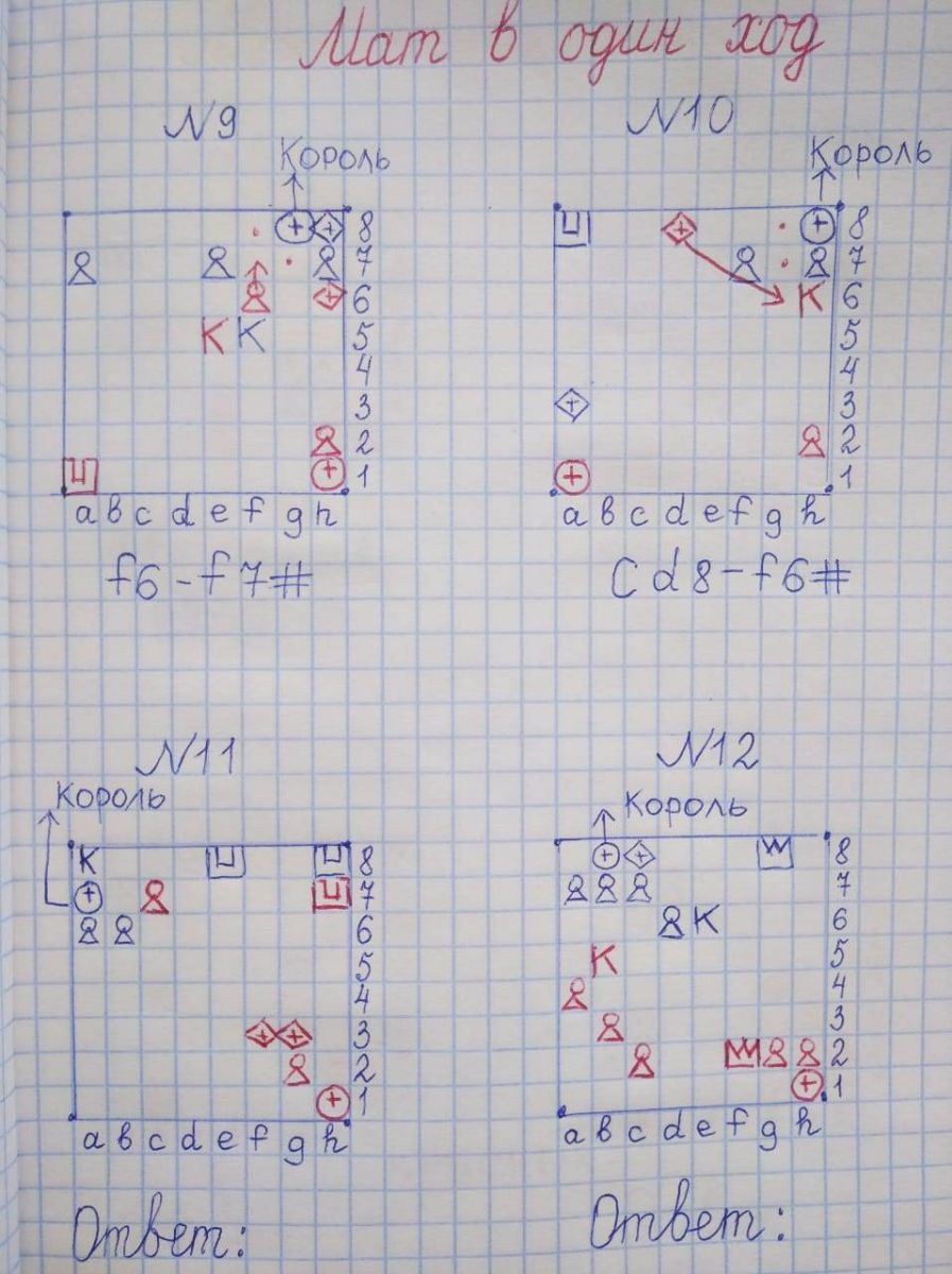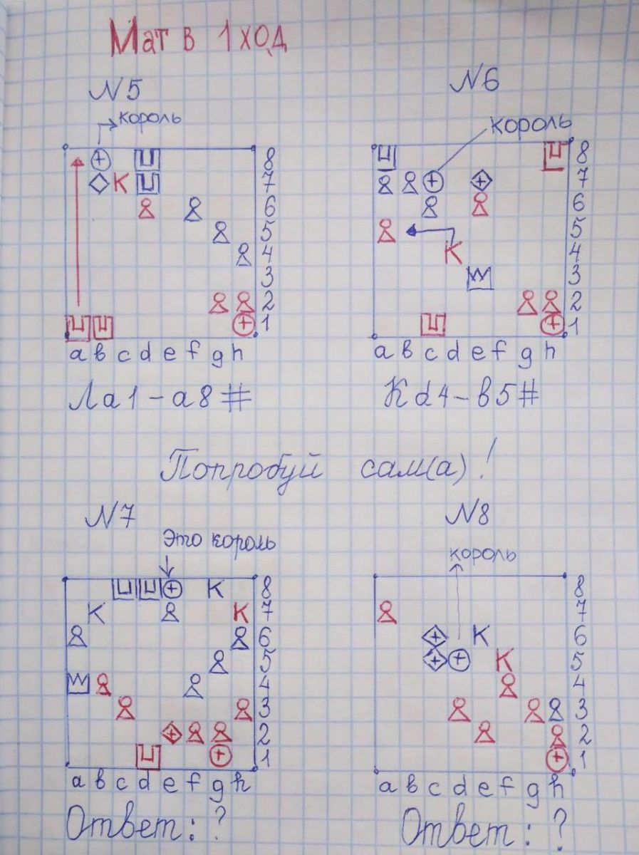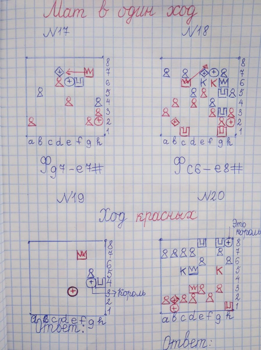 Мат в один ход. № 19,20. Указать в диаграмме матовый ход стрелкой и записать ход.