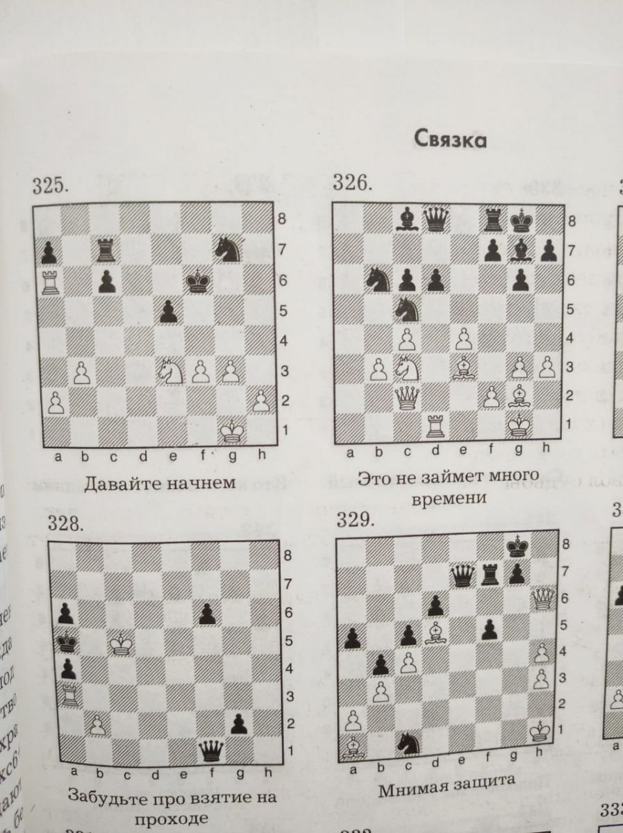 Ответы. 325 Ke3-d5+ Выигрывая ладью. 326/ Ce3x c5 пешка d5 связана 328.b2-b4# пешка А4 связана 329. Fh6xg7#