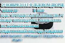 С 11 - 14 декабря 2014 года в Ледовом дворце "Юность" будет проводиться Открытое Первенство по хоккею среди юношей 2005 г.р. на Кубок Деда Мороза г. Мензелинск