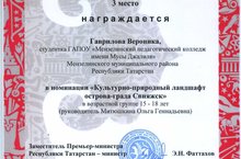 В соответствии с письмом от 24.11.2015 года и Положением проводился в г. Казани Республиканский конкурс рисунков и фоторабот о древнем городе Болгар и и Острове-граде Свияжск. На конкурсе было представлено 11 работ студентов образовательных организаций СПО из трех территорий РТ: Мензелинского муниципального района, г. Набережные Челны и г. Казани. Студентка педагогического колледжа, Гаврилова Вероника, была награждена дипломом 3 степени в номинации "Культурно-природный ландшафт острова-града Свияжск"