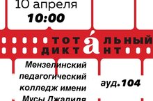 Уже завтра, 10 апреля 2021 года, состоится самый масштабный диктант по русскому языку! Мы ждем всех желающих в Мензелинском педагогическом колледже имени Мусы Джалиля по адресу: г.Мензелинск, ул.Мусы Джалиля д.18 в 10:00. Регистрация доступна по ссылке:https://totaldict.ru
