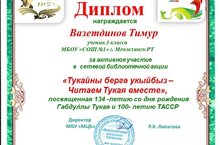 Вазетдинов Тимур, ученик 3Г класса, присоединился к сетевой акции "Тукайны бергә укыйбыз - Читаем Тукая вместе, в рамках 134летия со дня рождения Г.тукая и 100летия ТАССР, организованной Детской библиотекой МБУ "Центральная библиотечная система Нурлатского муниципального района"