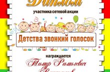 Вазетдинов Тимур, ученик 3Г класса, за участие в сетевой акции "Детства звонкий голосок , приуроченный к Международному дню защиты детей и организованной в рамкахпразднования Года памяти и славы, награжден Дипломом