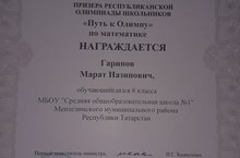 Гарипова Марат 8а сыйныфы укучысы математика фәненнән республика олимпиадасы призеры булды. Котлыйбыз һәм киләчәктә дә уңышлар телибез