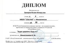 Фаррахов С, Закиров И., Рахматуллина А. - призёры ХII Республиканского конкурса научно - исследовательских, проектных и творческих работ учащихся «Я выбираю село»/ Фәррахов С., Закиров И., Рәхмәтуллина А. - укучыларның «Мин авылны сайлыйм» ХІІ республика фәнни - тикшеренү, проект һәм иҗат эшләре конкурсы призерлары