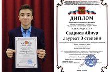 Ученик 9 класса средней школы №2 г. Мензелинска Айнур Садриев (руководитель: И.Р. Муллин) награждён дипломом Лауреата 3 степени финала Всероссийского конкурса научно-технического творчества «Юные техники ХХI века» /Минзәлә шәһәренең 2 нче урта мәктәбенең 9 нчы сыйныф укучысы Айнур Садриев (җитәкчесе: И.Р. Муллин) «ХХІ гасыр яшь техникалары» Бөтенроссия фәнни-техник иҗат бәйгесенең 3 нче дәрәҗә Лауреаты дипломы белән бүләкләнде. -