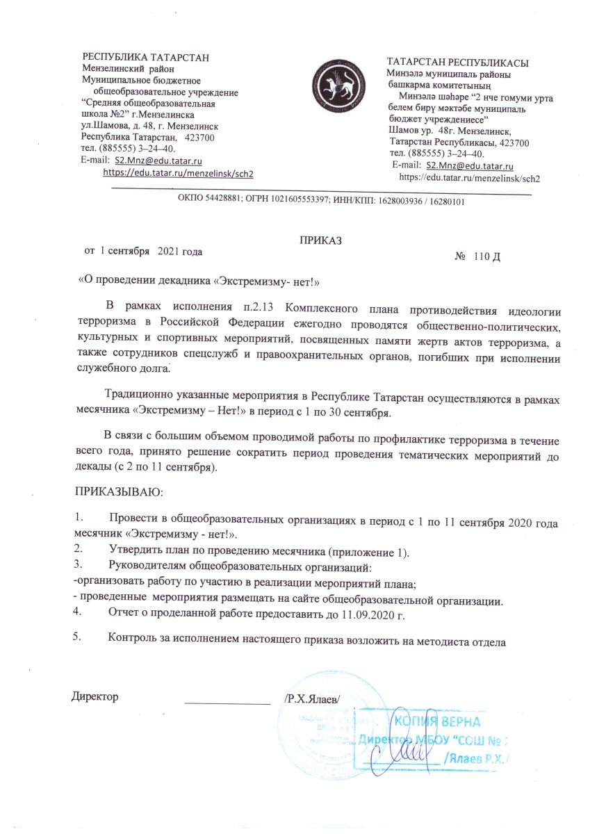Приказ МБОУ "СОШ №2" г. Мензелинска РТ от 01.09.21 г. №110 Д "О преведении декадника "Экстремизму - нет!"