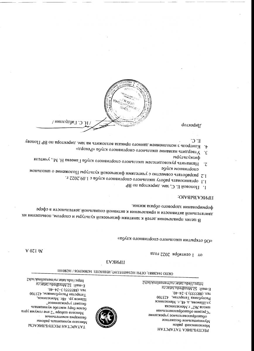 - Приказ МБОУ "СОШ №2" г. Мензелинска РТ "Об открытии спортивного клуба"