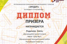 Ученица 6Б класса Родичева Злата участвовала на олимпиаде по татарскому языку «Эрудит» и показала отличные результаты по знанию татарского языка. Злата стала призером и награждена дипломом призера. Молодец!