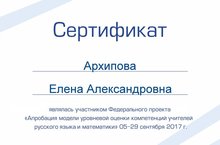 Учитель математики, Архипова Елена Александровна, с 5 по 29 сентября участвовала в Апробации модели уровневой оценки компетенций учителей математики и русского языка. После прохождения которой получила сертификат.