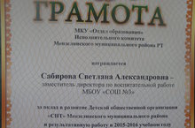 Поздравляем Сабирову Светлану Александровну, заместителя директора по воспитательной работе, которая награждена Грамотой МКУ "Отдел образования" Исполнительного комитета Мензелинского муниципального района "За вклад в развитие Детской общественной организации "СНТ" Мензелинского муниципального района и результативную работу в 2015-2016 учебном году".