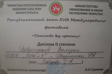 Поздравляем Доброгорскую Валерию учащуюся 2в класса нашей школы,которая стала обладателем Диплома 2 степени Республиканского этапа XVIII Международного фестиваля "Детство без границ" Руководитель Сабирова Светлана Александровна.