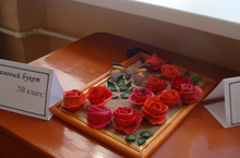 В рамках месячника экологического воспитания в школе прошла выставка работ учащихся "Новинки из мусорной корзинки". Были представлены работы, выполненные из брасового материала. Лучшей работа признана картина 5В класса из мандариновых корок.