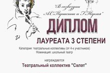 Театральный коллектив " Сэлэт", состоящий из учеников 4а и 4Б классов, под руководством Тимиркаевой О.А. и Залеевой Г.Г. награжден дипломом 3 степени в Республиканском творческом конкурсе " В созвездии А.С.Пушкина и Г.Тукая".