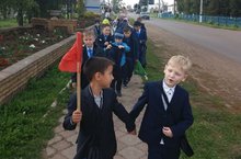 Первоклашки, ученики 1б класса, осваивают улицы города. Ребята знакомятся с дорожными знаками, учатся ходить в колонне, переходить дорогу по правилам на практике.