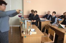 В рамках предметной недели были проведёны уроки по химии в 8А 8Б классах по теме "Растворы.Массовая доля раствора". На уроке демонстрировались цветные опыты с раствором перманганата калия и других реактивов. Использовалась презентация по теме.Учащиеся проявили высокий интерес при проведении практической части урока.