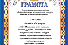 27 марта в Доме детского творчества г. Мензелинска состоялось награждение победителей муниципального тура Республиканского фестиваля-конкурса детского народного творчества "Без бергә". Ансамбль ложкарей под руководством Соловьёвой И.С. стал победителем в номинации «Ансамбль народных инструментов».
