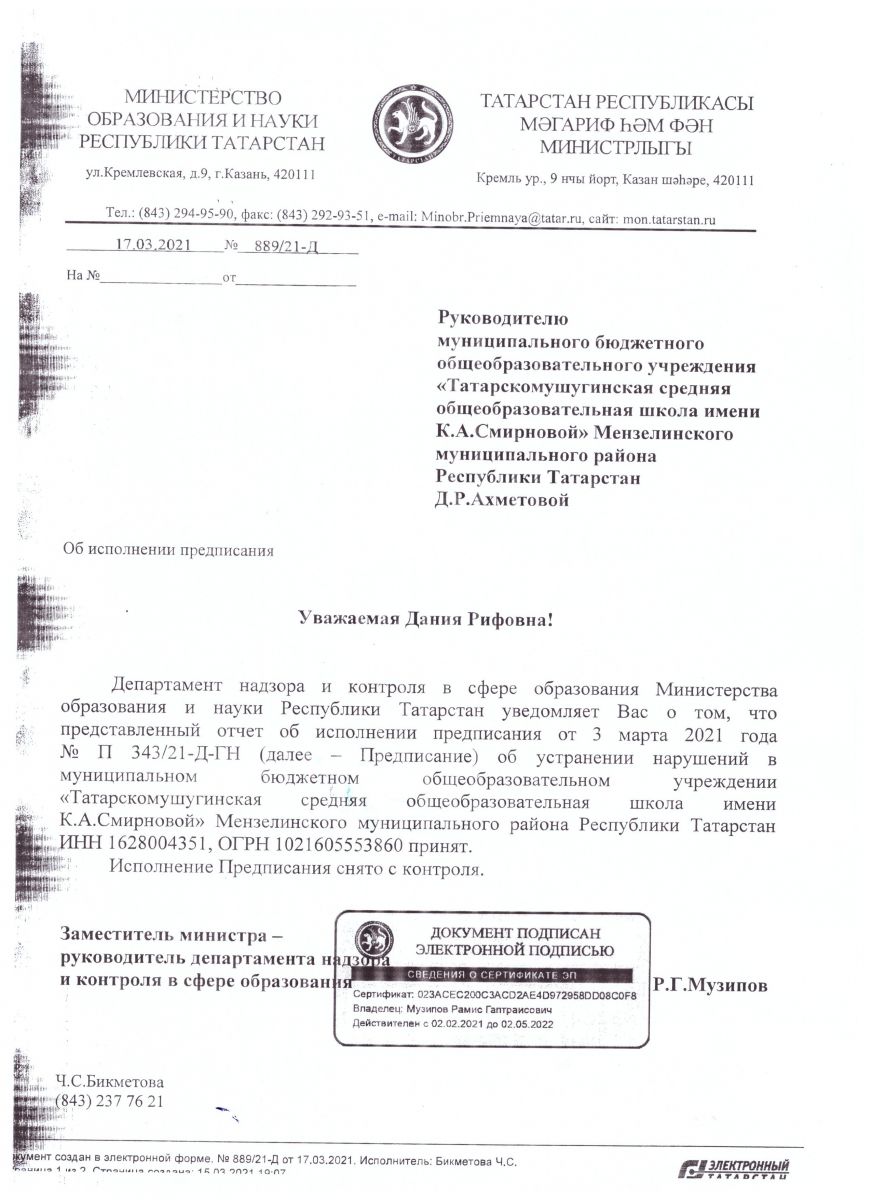 МБОУ "Татарскомушугинская средняя общеобразовательная школа имени К.А.Смирновой" Мензелинского муниципального района Республики Татарстан /Татарстан Республикасы Минзәлә муниципаль районы "К.А.Смирнова исемендәге Татар Мөшегесе урта гомуми белем мәктәбе" гомуми белем муниципаль бюджет учреждениесе