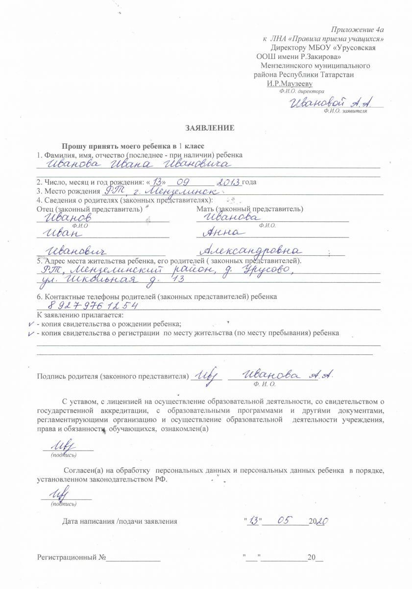 Образец заполнения заявления о приёме