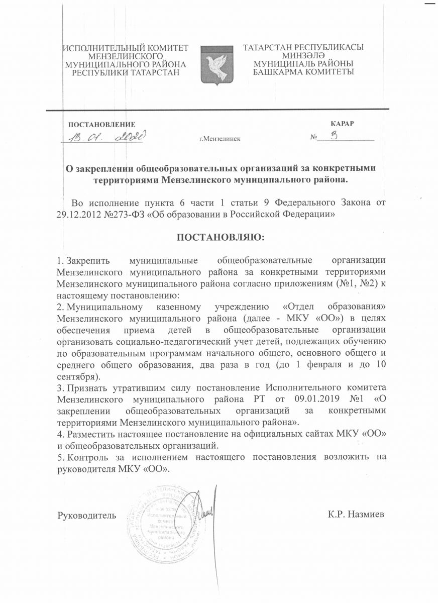 Постановление ИК ММР РТ № 55 от 24.02.2021 г О закреплении ОО за конкретными территориями ММР РТ