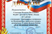 Безнең балалар бакчасында тәрбияләнүче Семенова Ильвина белән Муллина Поллина "Җиңү Көненең 75 еллыгына" багышланган Халыкара иҗат бәйгесендә катнашып дипломнар белән бүләкләнделәр.