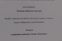 Мәктәпкә хәзерлек төркеменә йөрүче Хәсәнова Җәмиля "Шүрәле" шигыре белән "Туган тел" төбәк бәйгесендә катнашып, II урынын алды. Шигырьнең авторы - безнең тәрбияче Миронова Гулия Ринатовна. Чын күңелдән котлыйбыз!