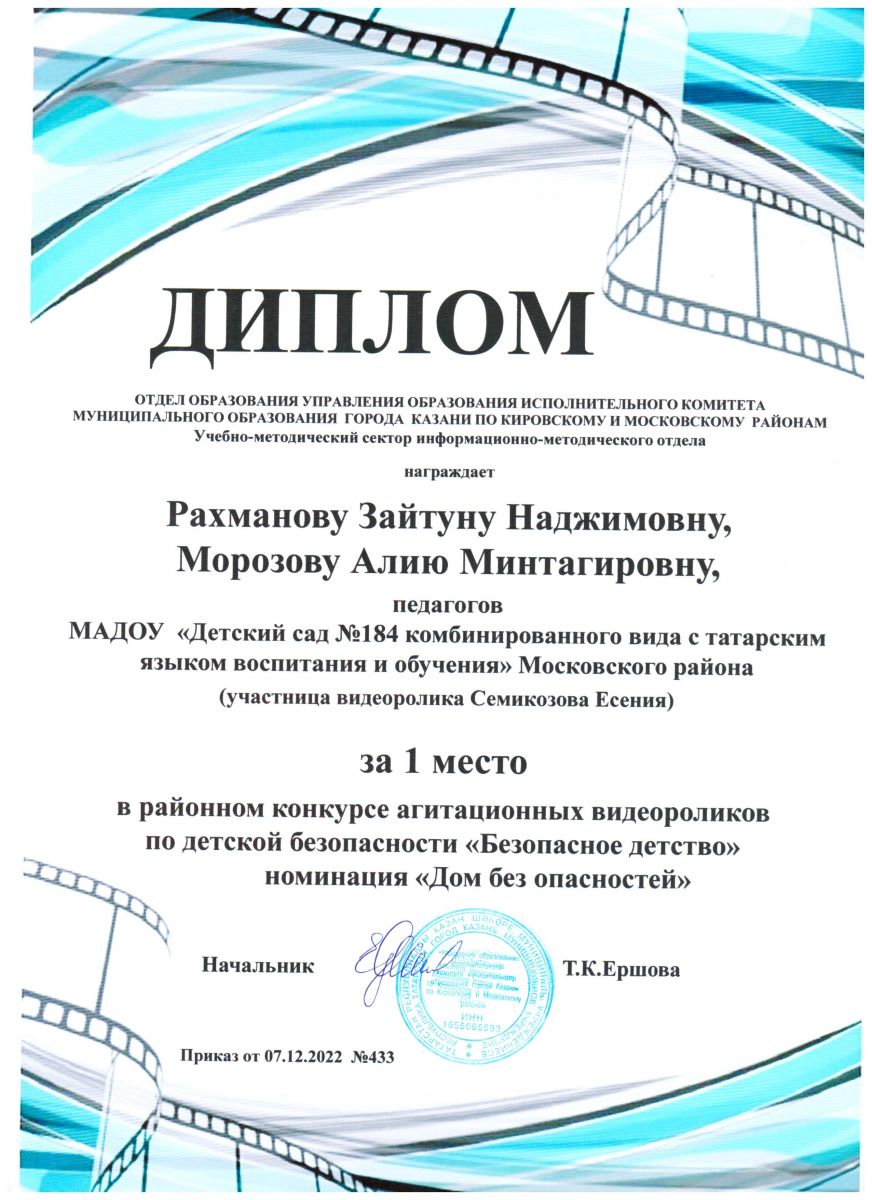 Поздравляем Семикозову Есению с победой в районном конкурсе агитационных видеороликов по детской безопасности "Безопасное детство"