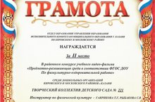 Творческий коллектив нашего детского сада принял активное участие в районном конкурсе учебного видео-фильма «Предметно-развивающая среда в соответствии ФГОС ДО по физкультурно-оздоровительной работе» и был награжден ГРАМОТОЙ за II МЕСТО. Поздравляем , так держать, МОЛОДЦЫ !!!!
